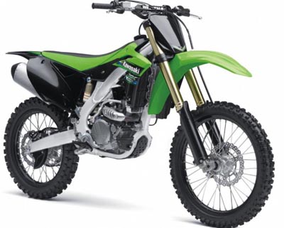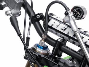 Die grosse Grüne hat für 2013 einen überarbeiteten Kolben bekommen, um 0,2 mm niedriger als der von 2012, samt neuer Oberfläche. Die Einlasskanäle wurden überarbeitet, neue Mappings bei allen 3 Varianten (Hart, Soft, Standard). Wie die 2012er hat sie Launch Control welche euch beim Start den notwendigen Vorsprung beim Kampf um den Holeshot sichern soll. Mit der Kayaba Pneumatic Spring Fork (PSF), sozusagen der Druckluft-Gabel ;-), setzt Kawasaki bei der 450er auf Kayaba und eine technische Neuheit gegenüber der 250er welche ja mit Showa ausgestattet ist. Diese Kayaba-Gabel hat dadurch eine Gewichtsersparnis von satten 750g und wird einfach mit einer Luftpumpe härter oder weicher eingestellt. Natürlich hat sie dennoch Druck- und Zugstufe. Sie hat dadurch einen sehr grossen Setup-Bereich, ausserdem weniger Reibung (Luft statt Feder). Die Einstellung des Luftdruck's der neuen Kayaba Gabel erfolgt simpel mit einem Adapter den man oben auf die Gabel setzt und danach eine beliebige Luftpumpe mit Manometer anschliesst. Am Hinterrad gibt es eine neue Aufhängung des Uni-Trak Systems. Die Fussrasten sind 2-fach verstellbar, um 5mm tiefer als Standard.